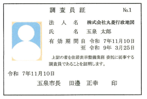現地調査は、市が委託する「株式会社丸菱行政地図」が行います。調査員は「住居表示整備事業調査員」の腕章を付け、市が発行した身分証明書を携行しています。