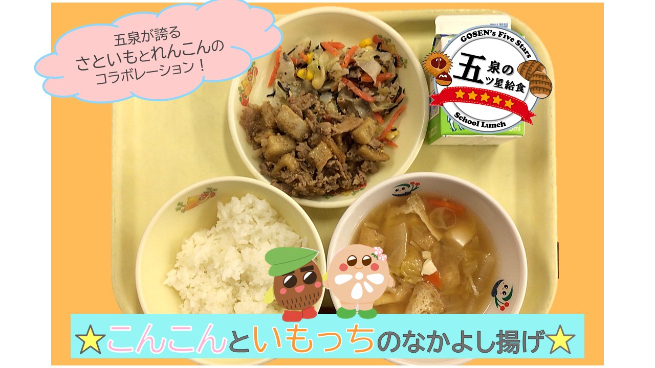 五泉市が誇るさといも(きぬおとめ)とれんこん(五泉美人)を使ったご飯が進むおかずです。また、すりごまの風味で少ない調味料でもおいしく食べられる「うましお」メニューです。